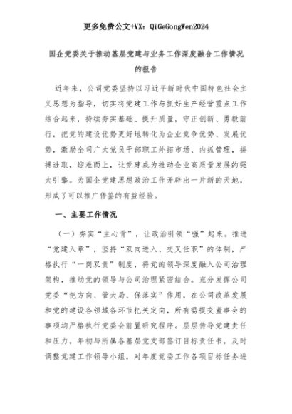 【七哥公文】2025年:国企党委关于推动基层党建与业务工作深度融合工作情况的报告+更多免费公文+VX:QiGeGongWen2024+更多免费公文+VX:QiGeGongWen2024