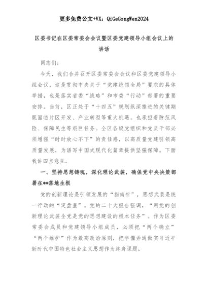 【七哥公文】2025年:区委书记在区委常委会会议暨区委党建领导小组会议上的讲话+更多免费公文+VX:QiGeGongWen2024+更多免费公文+VX:QiGeGongWen2024
