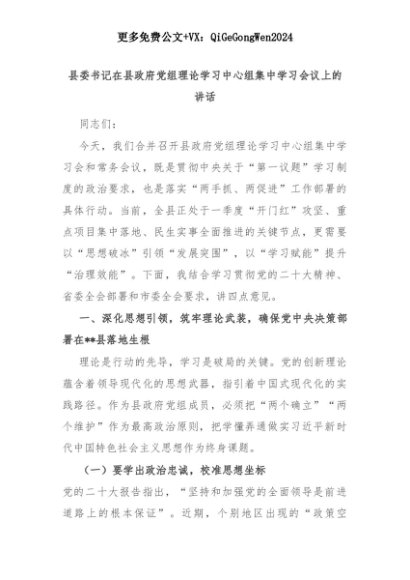 【七哥公文】2025年:县委书记在县政府党组理论学习中心组集中学习会议上的讲话+更多免费公文+VX:QiGeGongWen2024+更多免费公文+VX:QiGeGongWen2024