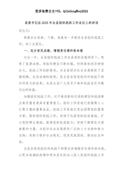 【七哥公文】2025年:县委书记在2025年全县组织统战工作会议上的讲话+更多免费公文+VX:QiGeGongWen2024+更多免费公文+VX:QiGeGongWen2024