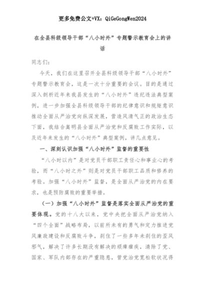 【七哥公文】2025年:在全县科级领导干部“八小时外”专题警示教育会上的讲话+更多免费公文+VX:QiGeGongWen2024+更多免费公文+VX:QiGeGongWen2024