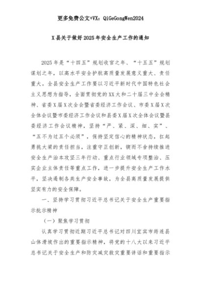 【七哥公文】2025年:X县关于做好2025年安全生产工作的通知+更多免费公文+VX:QiGeGongWen2024+更多免费公文+VX:QiGeGongWen2024