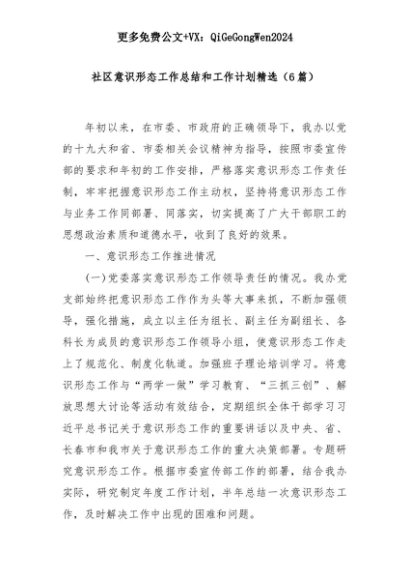 【七哥公文】2025年:(6篇)社区意识形态工作总结和工作计划精选+更多免费公文+VX:QiGeGongWen2024+更多免费公文+VX:QiGeGongWen2024