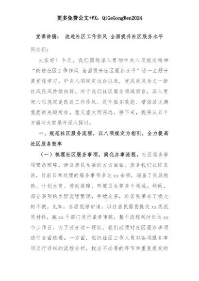 【七哥公文】2025年:党课讲稿: 改进社区工作作风 全面提升社区服务水平+更多免费公文+VX:QiGeGongWen2024+更多免费公文+VX:QiGeGongWen2024