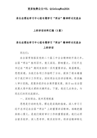 【七哥公文】2025年:(3篇)局长在理论学习中心组专题学习“两会”精神研讨交流会上的讲话材料汇编+更多免费公文+VX:QiGeGongWen2024+更多免费公文+VX:QiGeGongWen2024