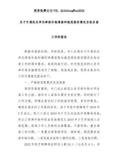 【七哥公文】2025年:关于开展机关单位津贴补贴清查和规范落实情况自检自查工作的报告+更多免费公文+VX:QiGeGongWen2024+更多免费公文+VX:QiGeGongWen2024