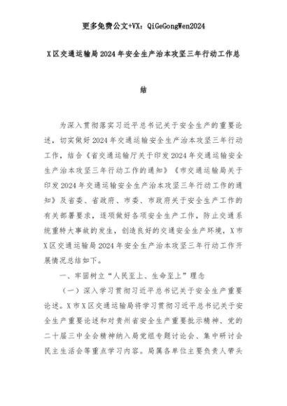 【七哥公文】2025年:X区交通运输局2024年安全生产治本攻坚三年行动工作总结+更多免费公文+VX:QiGeGongWen2024+更多免费公文+VX:QiGeGongWen2024