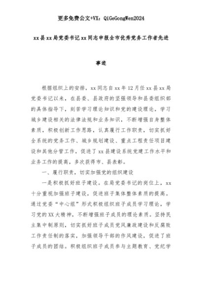 【七哥公文】2025年:xx县xx局党委书记xx同志申报全市优秀党务工作者先进事迹+更多免费公文+VX:QiGeGongWen2024+更多免费公文+VX:QiGeGongWen2024