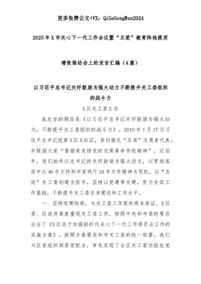 【七哥公文】2025年:(4篇)2025年X市关心下一代工作会议暨“五爱”教育阵地提质增效推动会上的发言汇编+更多免费公文+VX:QiGeGongWen2024+更多免费公文+VX:QiGeGongWen2024
