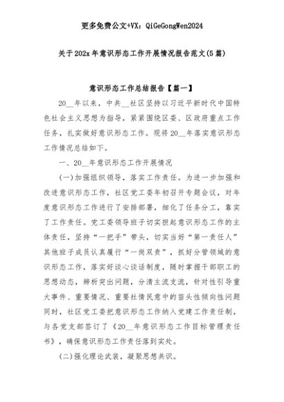【七哥公文】2025年:(5篇)关于202x年意识形态工作开展情况报告范文+更多免费公文+VX:QiGeGongWen2024+更多免费公文+VX:QiGeGongWen2024