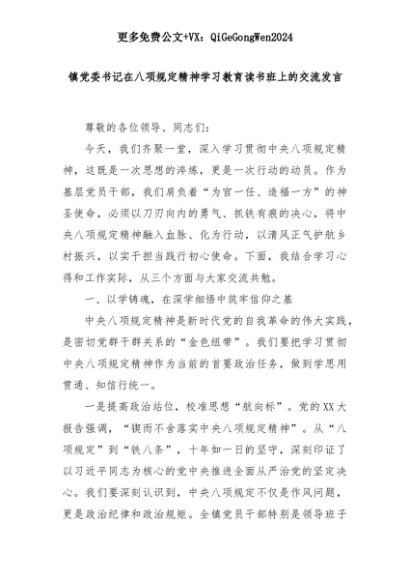 【七哥公文】2025年:镇党委书记在八项规定精神学习教育读书班上的交流发言+更多免费公文+VX:QiGeGongWen2024+更多免费公文+VX:QiGeGongWen2024