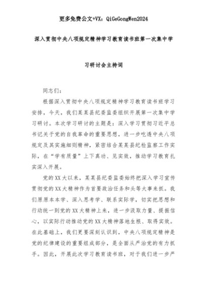 【七哥公文】2025年:深入贯彻中央八项规定精神学习教育读书班第一次集中学习研讨会主持词+更多免费公文+VX:QiGeGongWen2024+更多免费公文+VX:QiGeGongWen2024