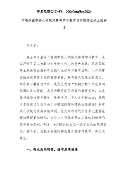 【七哥公文】2025年:市领导在中央八项规定精神学习教育读书班结业式上的讲话+更多免费公文+VX:QiGeGongWen2024+更多免费公文+VX:QiGeGongWen2024