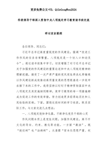 【七哥公文】2025年:科级领导干部深入贯彻中央八项规定学习教育读书班交流研讨发言提纲+更多免费公文+VX:QiGeGongWen2024+更多免费公文+VX:QiGeGongWen2024