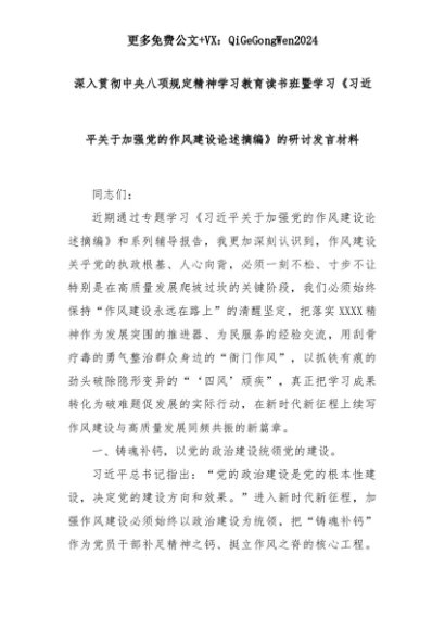 【七哥公文】2025年:深入贯彻中央八项规定精神学习教育读书班暨学习《习总书记关于加强党的作风建设论述摘编》的研讨发言材料+更多免费公文+VX:QiGeGongWen2024+更多免费公文+VX:QiGeGongWen2024