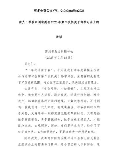 【七哥公文】2025年:在九三学社四川省委会2025年第二次机关干部学习会上的讲话+更多免费公文+VX:QiGeGongWen2024+更多免费公文+VX:QiGeGongWen2024