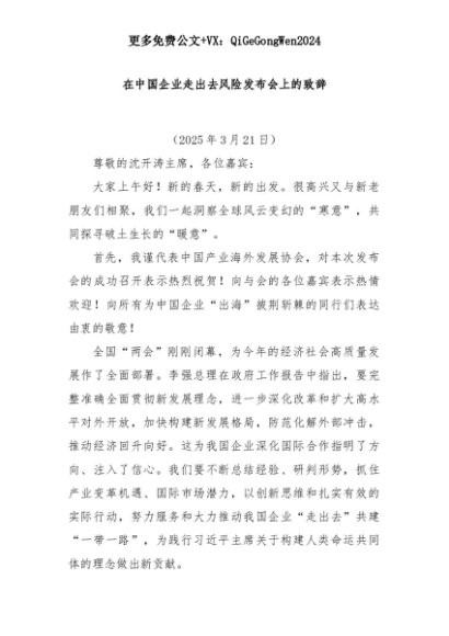 【七哥公文】2025年:在中国企业走出去风险发布会上的致辞+更多免费公文+VX:QiGeGongWen2024+更多免费公文+VX:QiGeGongWen2024