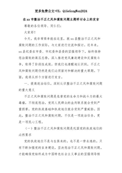 【七哥公文】2025年:在xx市整治不正之风和腐败问题主题研讨会上的发言+更多免费公文+VX:QiGeGongWen2024+更多免费公文+VX:QiGeGongWen2024