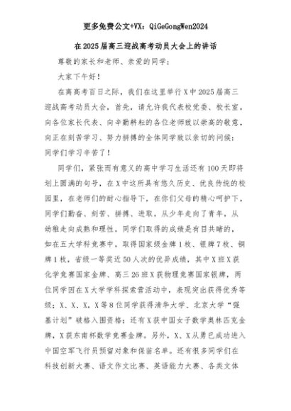 【七哥公文】2025年:在2025届高三迎战高考动员大会上的讲话+更多免费公文+VX:QiGeGongWen2024+更多免费公文+VX:QiGeGongWen2024