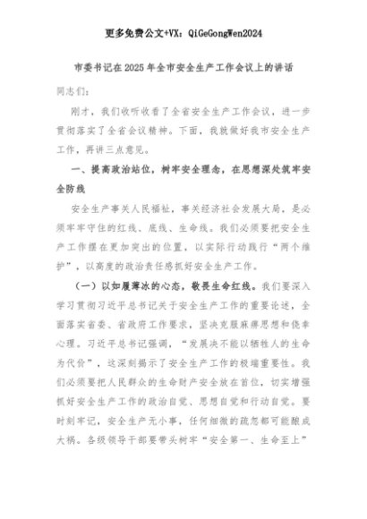【七哥公文】2025年:市委书记在2025年全市安全生产工作会议上的讲话+更多免费公文+VX:QiGeGongWen2024+更多免费公文+VX:QiGeGongWen2024