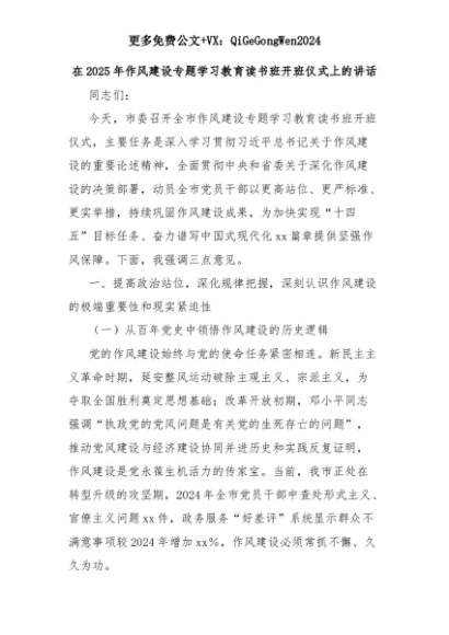 【七哥公文】2025年:在2025年作风建设专题学习教育读书班开班仪式上的讲话+更多免费公文+VX:QiGeGongWen2024+更多免费公文+VX:QiGeGongWen2024
