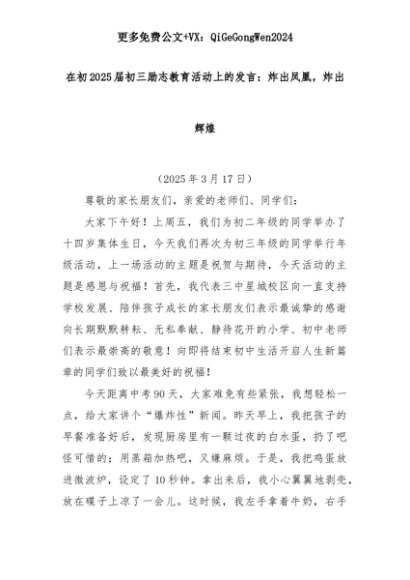 【七哥公文】2025年:在初2025届初三励志教育活动上的发言:炸出凤凰,炸出辉煌+更多免费公文+VX:QiGeGongWen2024+更多免费公文+VX:QiGeGongWen2024