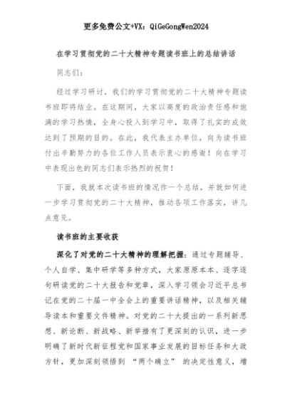 【七哥公文】2025年:在学习贯彻党的二十大精神专题读书班上的总结讲话+更多免费公文+VX:QiGeGongWen2024+更多免费公文+VX:QiGeGongWen2024