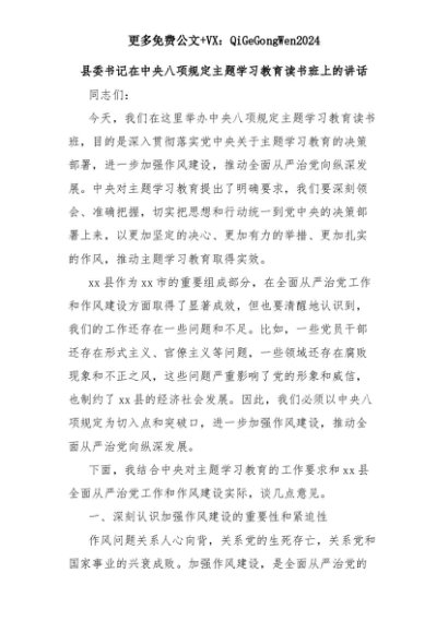 【七哥公文】2025年:县委书记在中央八项规定主题学习教育读书班上的讲话+更多免费公文+VX:QiGeGongWen2024+更多免费公文+VX:QiGeGongWen2024