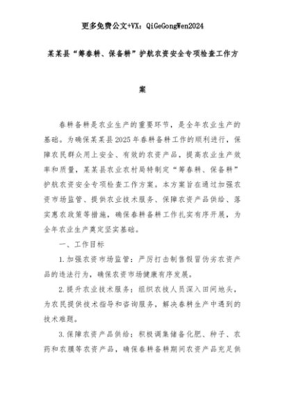 【七哥公文】2025年:某某县“筹春耕、保备耕”护航农资安全专项检查工作方案+更多免费公文+VX:QiGeGongWen2024+更多免费公文+VX:QiGeGongWen2024