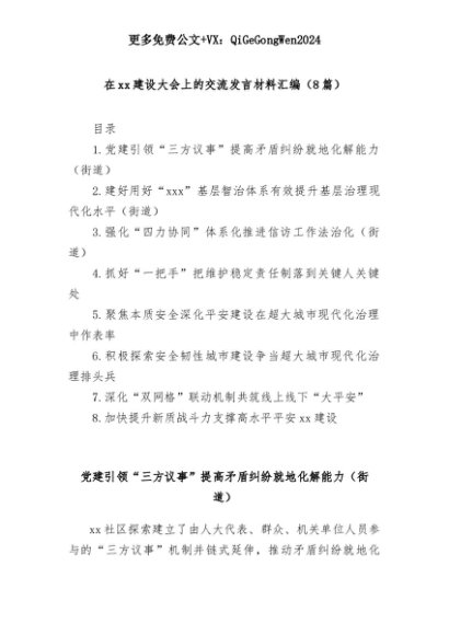 【七哥公文】2025年:(8篇)在xx建设大会上的交流发言材料汇编+更多免费公文+VX:QiGeGongWen2024+更多免费公文+VX:QiGeGongWen2024
