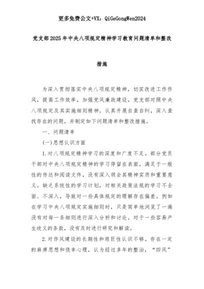 【七哥公文】2025年:党支部 2025 年中央八项规定精神学习教育问题清单和整改措施+更多免费公文+VX:QiGeGongWen2024+更多免费公文+VX:QiGeGongWen2024