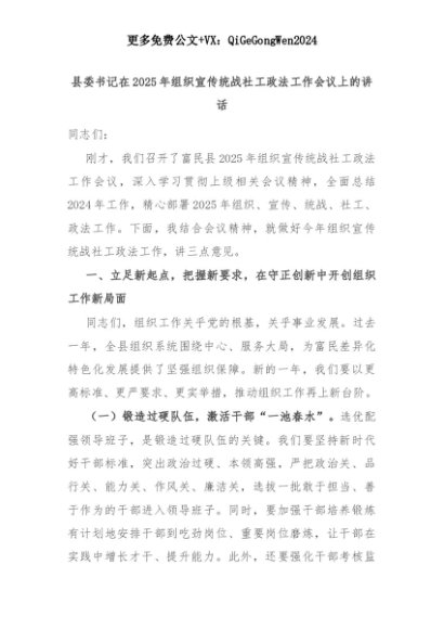 【七哥公文】2025年:县委书记在2025年组织宣传统战社工政法工作会议上的讲话+更多免费公文+VX:QiGeGongWen2024+更多免费公文+VX:QiGeGongWen2024