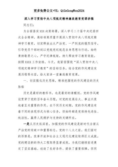 【七哥公文】2025年:深入学习贯彻中央八项规定精神廉政教育党课讲稿+更多免费公文+VX:QiGeGongWen2024+更多免费公文+VX:QiGeGongWen2024