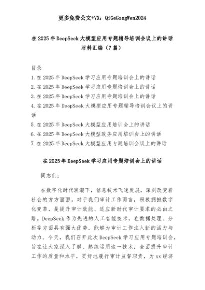 【七哥公文】2025年:(7篇)在2025年DeepSeek大模型应用专题辅导培训会议上的讲话材料汇编+更多免费公文+VX:QiGeGongWen2024+更多免费公文+VX:QiGeGongWen2024