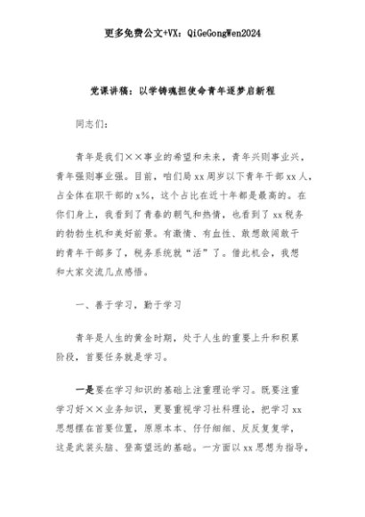【七哥公文】2025年:党课讲稿:以学铸魂担使命青年逐梦启新程(税务)+更多免费公文+VX:QiGeGongWen2024+更多免费公文+VX:QiGeGongWen2024