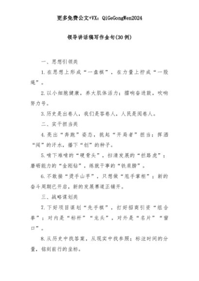 【七哥公文】2025年:(30例)领导讲话稿写作金句+更多免费公文+VX:QiGeGongWen2024+更多免费公文+VX:QiGeGongWen2024