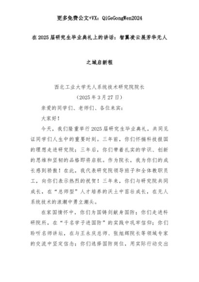 【七哥公文】2025年:在2025届研究生毕业典礼上的讲话:智翼凌云展芳华无人之域启新程+更多免费公文+VX:QiGeGongWen2024+更多免费公文+VX:QiGeGongWen2024