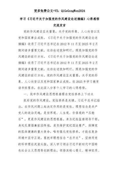 【七哥公文】2025年:学习《习近平关于加强党的作风建设论述摘编》心得感悟交流发言+更多免费公文+VX:QiGeGongWen2024+更多免费公文+VX:QiGeGongWen2024