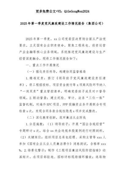 【七哥公文】2025年:2025年第一季度党风廉政建设工作情况报告(集团公司)+更多免费公文+VX:QiGeGongWen2024+更多免费公文+VX:QiGeGongWen2024