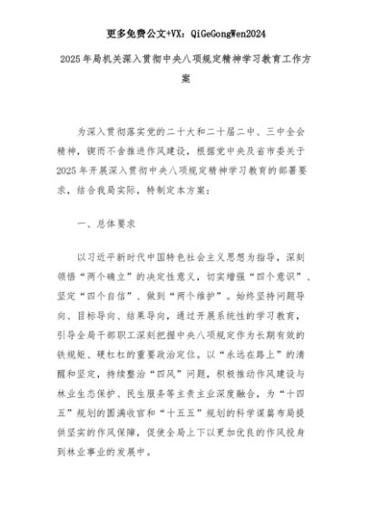 【七哥公文】2025年:2025年局机关深入贯彻中央八项规定精神学习教育工作方案+更多免费公文+VX:QiGeGongWen2024+更多免费公文+VX:QiGeGongWen2024