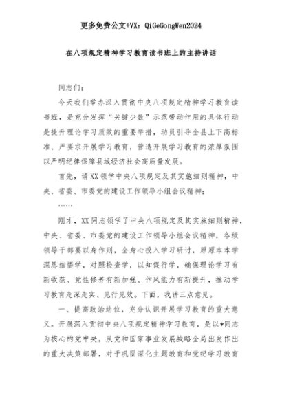 【七哥公文】2025年:在八项规定精神学习教育读书班上的主持讲话+更多免费公文+VX:QiGeGongWen2024+更多免费公文+VX:QiGeGongWen2024