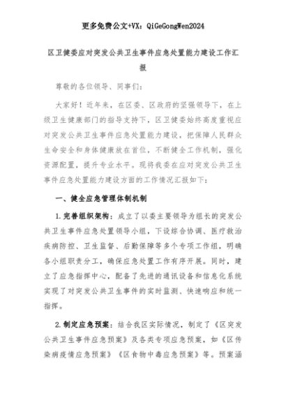 【七哥公文】2025年:区卫健委应对突发公共卫生事件应急处置能力建设工作汇报+更多免费公文+VX:QiGeGongWen2024+更多免费公文+VX:QiGeGongWen2024