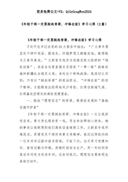 【七哥公文】2025年:(2篇)《年轻干部一定要挺起脊梁、冲锋在前》学习心得+更多免费公文+VX:QiGeGongWen2024+更多免费公文+VX:QiGeGongWen2024