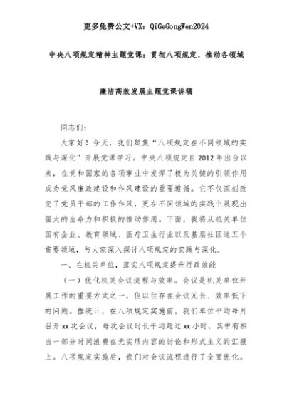 【七哥公文】2025年:中央八项规定精神主题党课:贯彻八项规定,推动各领域廉洁高效发展主题党课讲稿+更多免费公文+VX:QiGeGongWen2024+更多免费公文+VX:QiGeGongWen2024