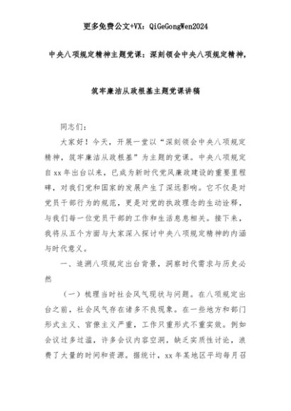 【七哥公文】2025年:中央八项规定精神主题党课:深刻领会中央八项规定精神,筑牢廉洁从政根基主题党课讲稿+更多免费公文+VX:QiGeGongWen2024+更多免费公文+VX:QiGeGongWen2024
