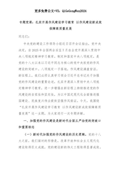 【七哥公文】2025年:专题党课:扎实开展作风建设学习教育 以作风建设新成效保障高质量发展+更多免费公文+VX:QiGeGongWen2024+更多免费公文+VX:QiGeGongWen2024
