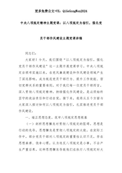 【七哥公文】2025年:中央八项规定精神主题党课:以八项规定为指引,强化党员干部作风建设主题党课讲稿+更多免费公文+VX:QiGeGongWen2024+更多免费公文+VX:QiGeGongWen2024