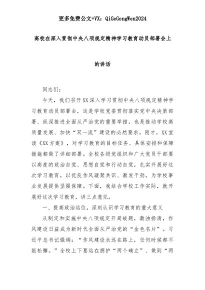【七哥公文】2025年:高校在深入贯彻中央八项规定精神学习教育动员部署会上的讲话+更多免费公文+VX:QiGeGongWen2024+更多免费公文+VX:QiGeGongWen2024