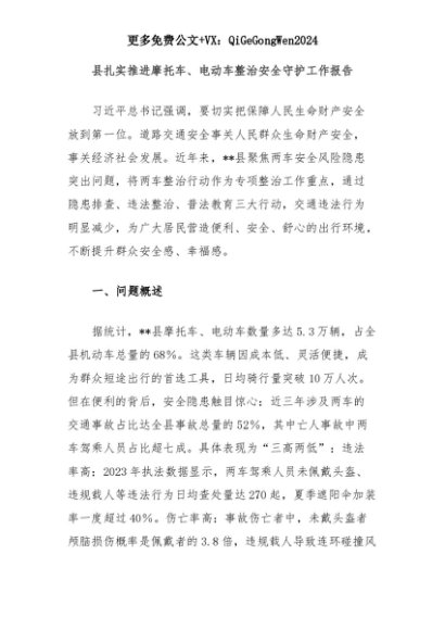 【七哥公文】2025年:县扎实推进摩托车、电动车整治安全守护工作报告+更多免费公文+VX:QiGeGongWen2024+更多免费公文+VX:QiGeGongWen2024