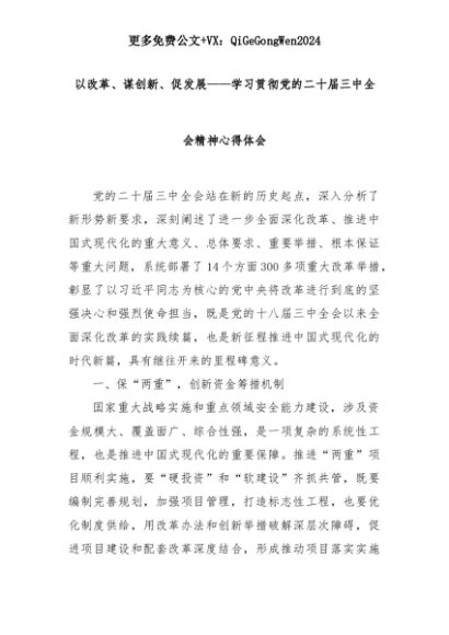 【七哥公文】2025年:以改革、谋创新、促发展——学习贯彻党的二十届三中全会精神心得体会+更多免费公文+VX:QiGeGongWen2024+更多免费公文+VX:QiGeGongWen2024